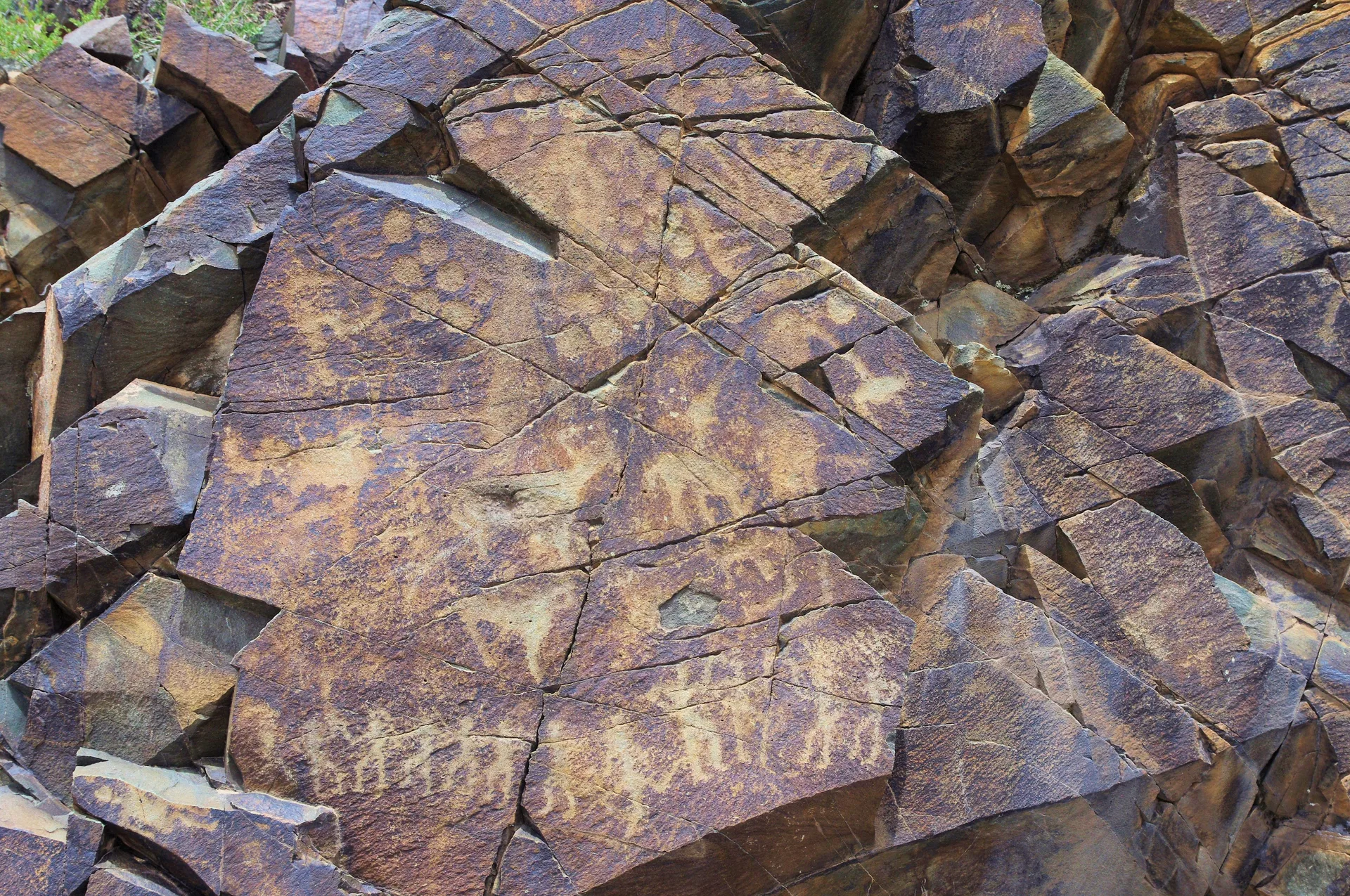 Tip: The runic graffiti is easiest to distinguish from zoomorphic imagery by its linear, angular character strokes. Carry a printed reference to Old Turkic (Orkhon) script if you want to identify individual characters. The panels are not signposted — the 2005 Baipakov et al. monograph has gorge-by-gorge plans and is the most reliable field guide.